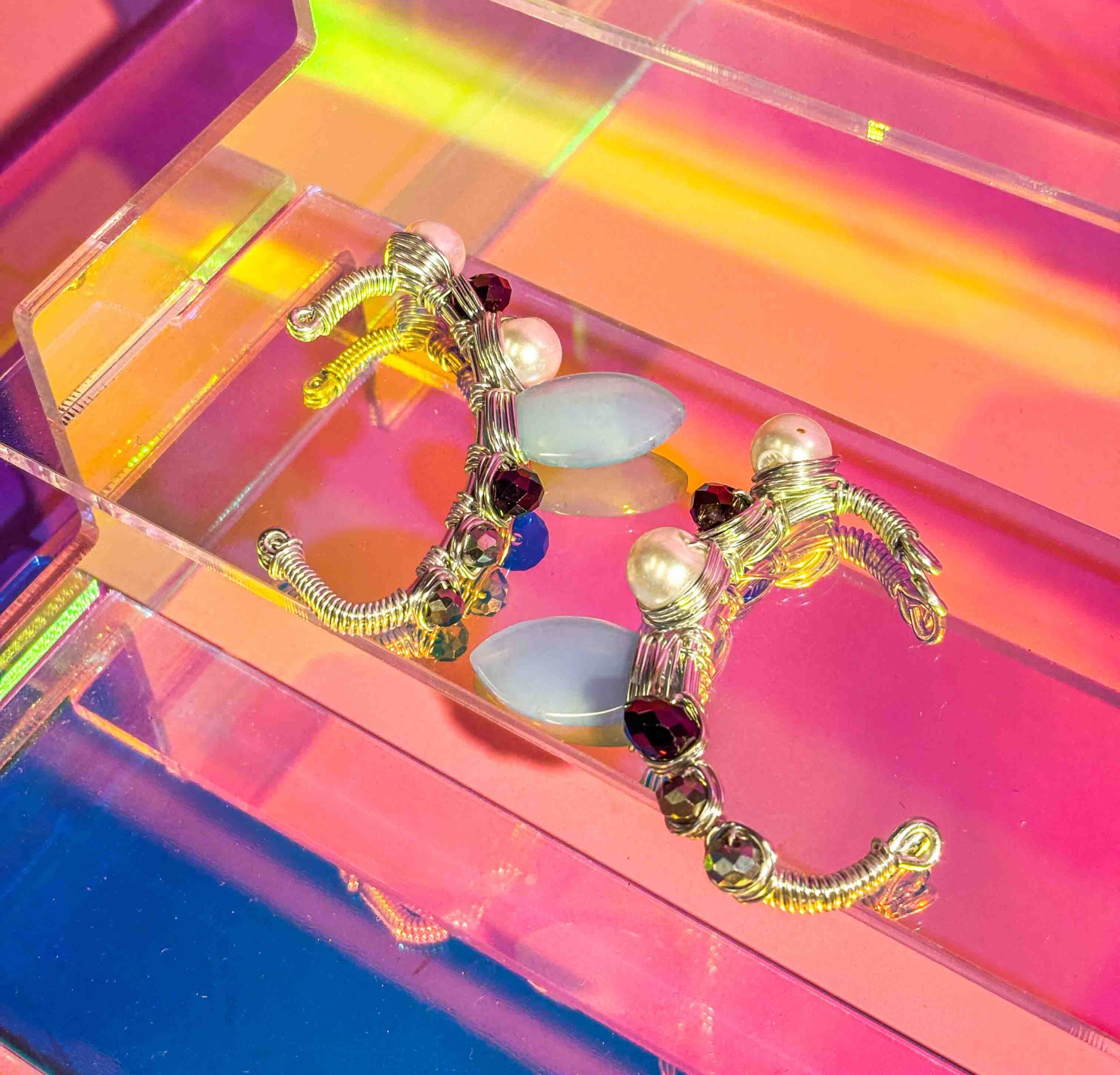 A futuristic art piece that climbs the ear and kisses the cheek, our Cosmic Ear Vine is sculpted by hand, intertwined with luminous maurica pearls, black, and silver fire flash polished cystals, and finished off with a wide moonlight thorn that glows in periwinkle. Made of non-tarnish silver aluminum.
