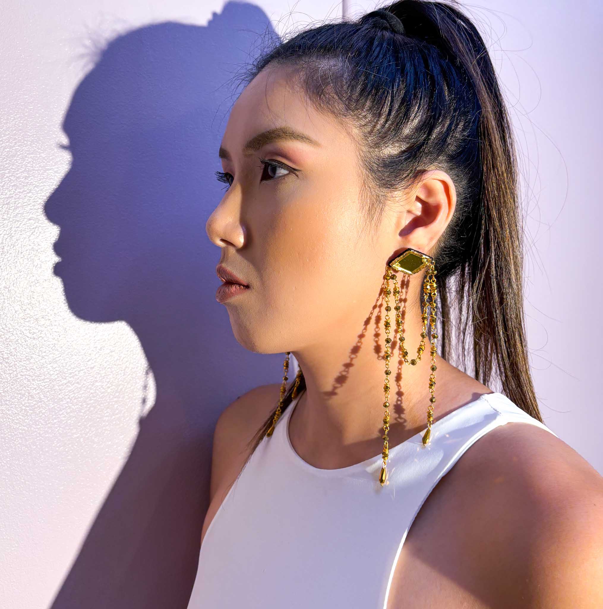 Drippin’ in gold. Our Gold Diamond Drip Earrings are crazy, sexy, cool. Wear it from your matcha run to your cocktails. This pair is made from mirrors, non-tarnish gold aluminum, gold fire flash polished crystals, and mixed with nickel.