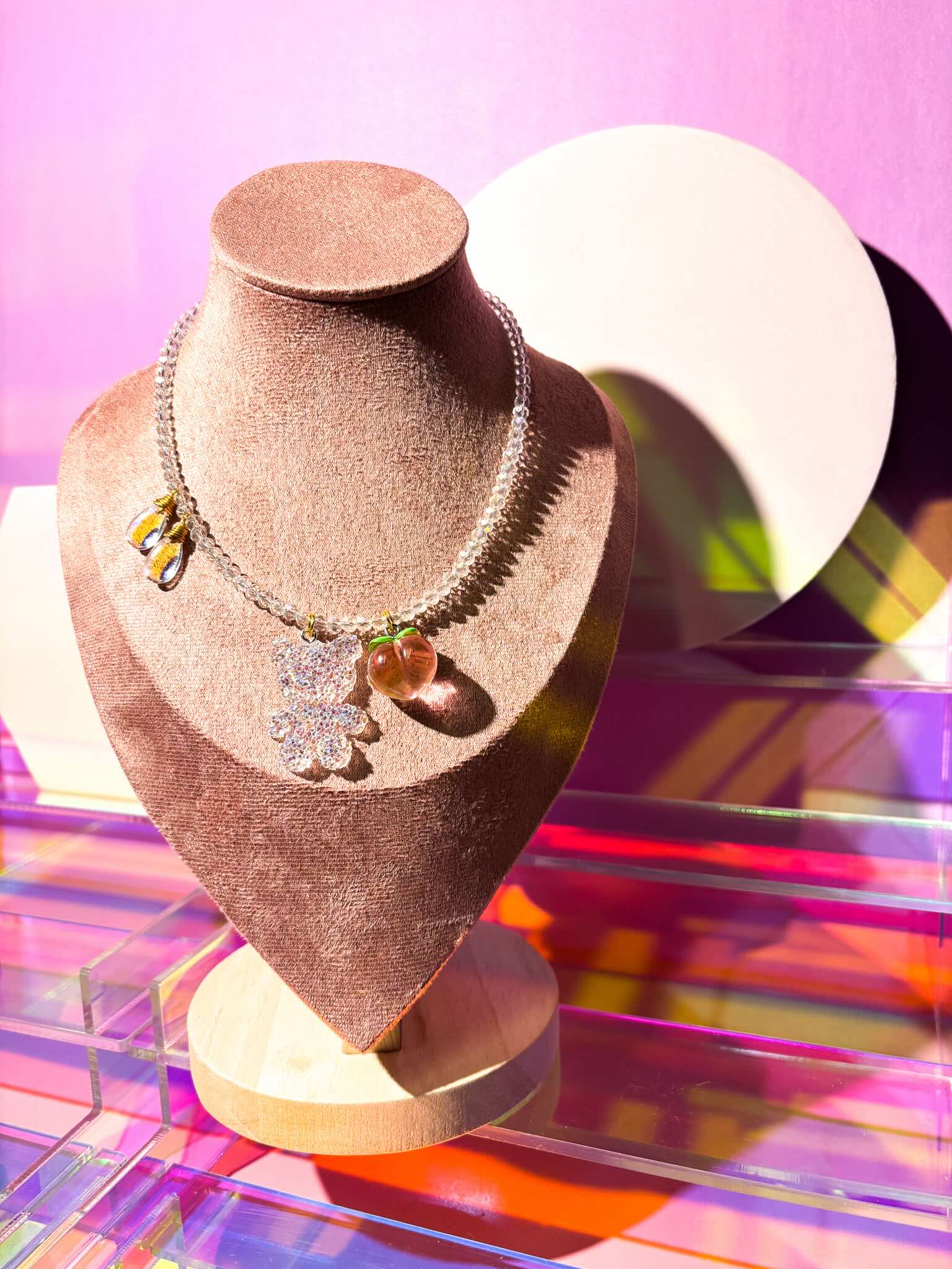 This necklace is made of molded peach and crystallized bear resin pendants with luminous glass water drops, suspended in a dainty translucent crystal cord.
