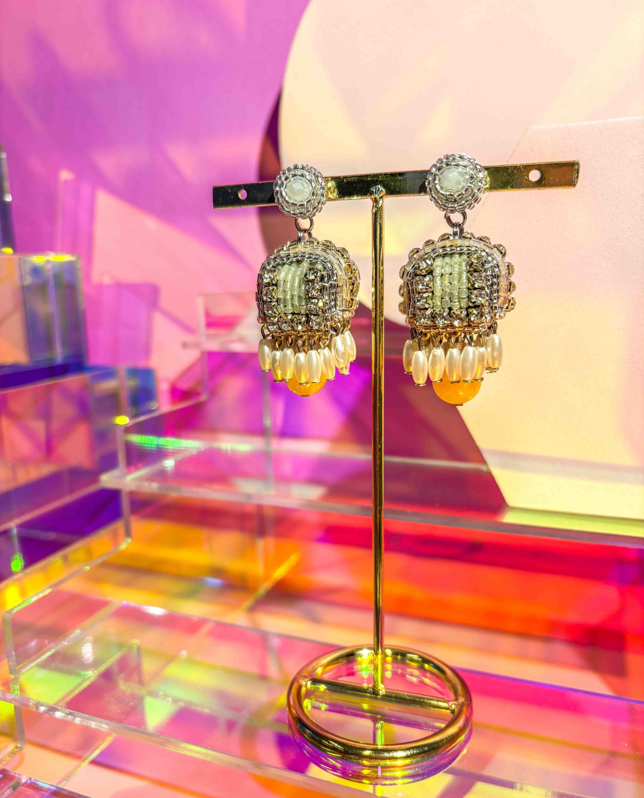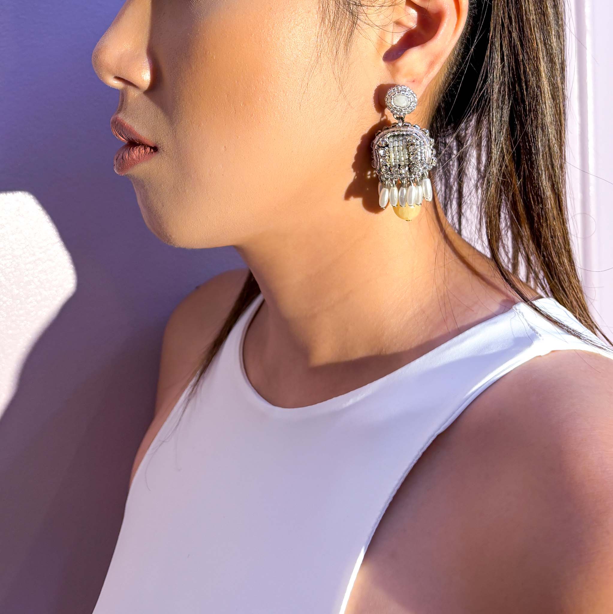 These lantern earrings glow with the soft radiance of daylight with their hints of warm butter yellow, and with Yellow Jade stone lightbulbs framed with white pearlescent fringe. This dreamy pair is hand-stitched and assembled with rhinestones, japanese and taiwanese seed beads.