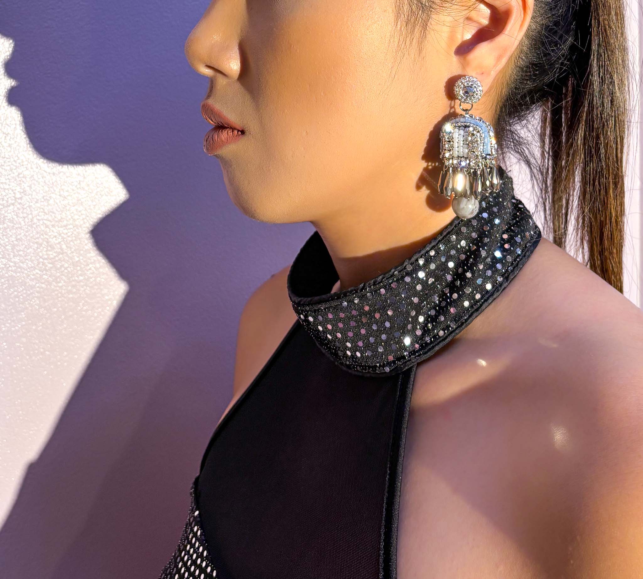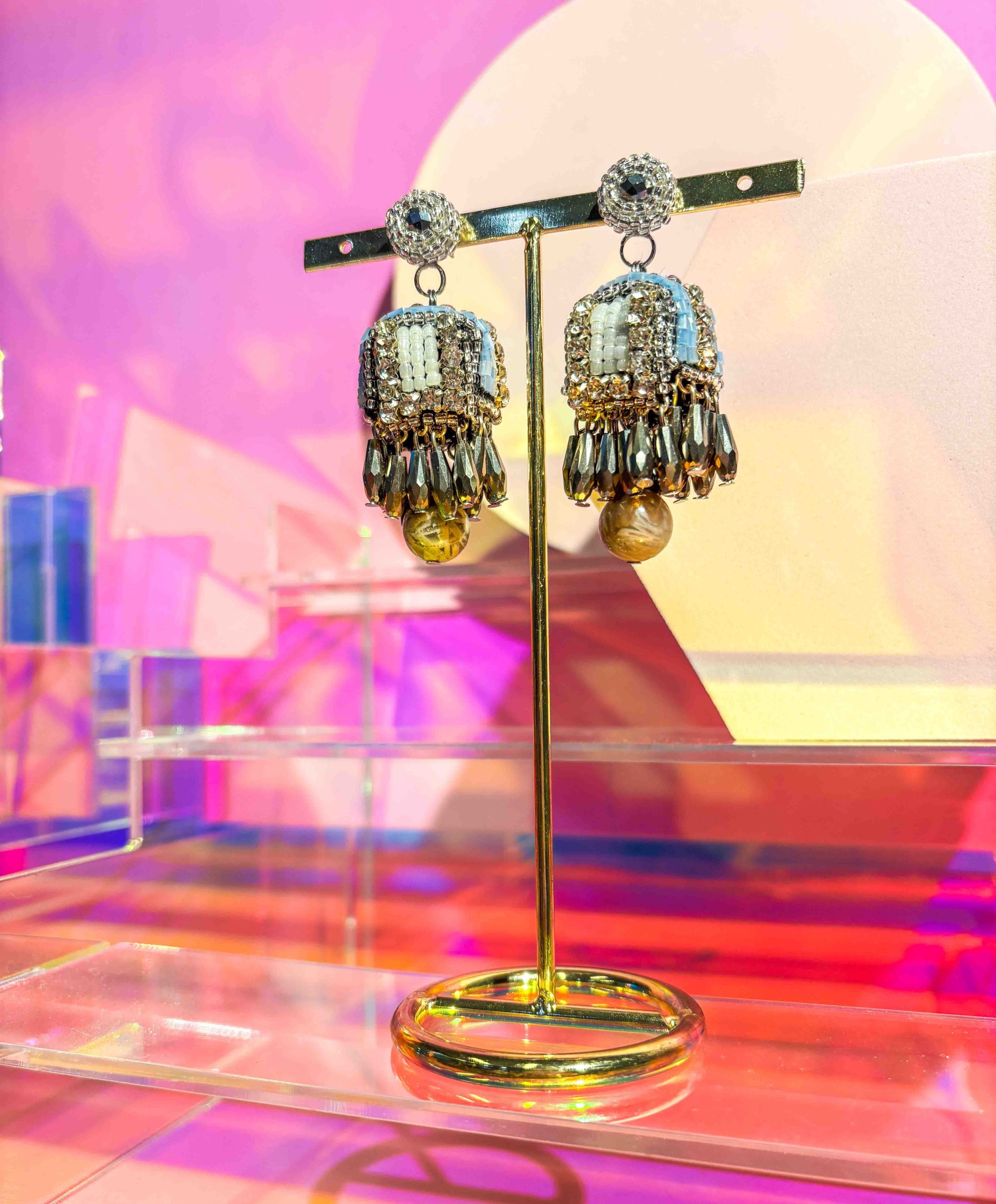 With a chandelier-meets-discoball vibe, these mini lantern earrings are your perfectly small and wearable statement piece to wear just about everywhere. Smoky steel and silver, and full of movement, this structural pair is hand-stitched and assembled with rhinestones, japanese and taiwanese seed beads, fire flash polished crystals, and round dangling Botswana agate stones.