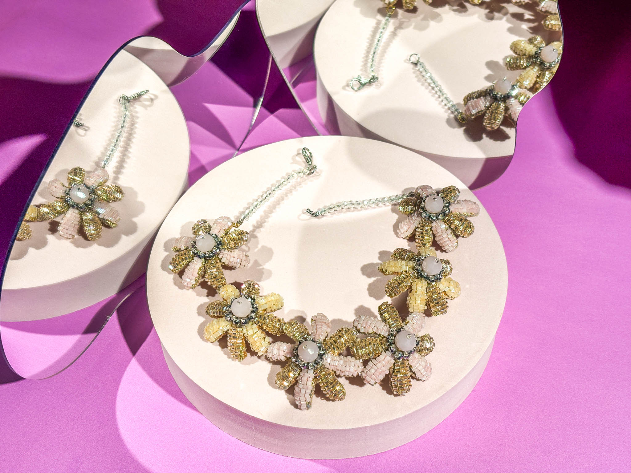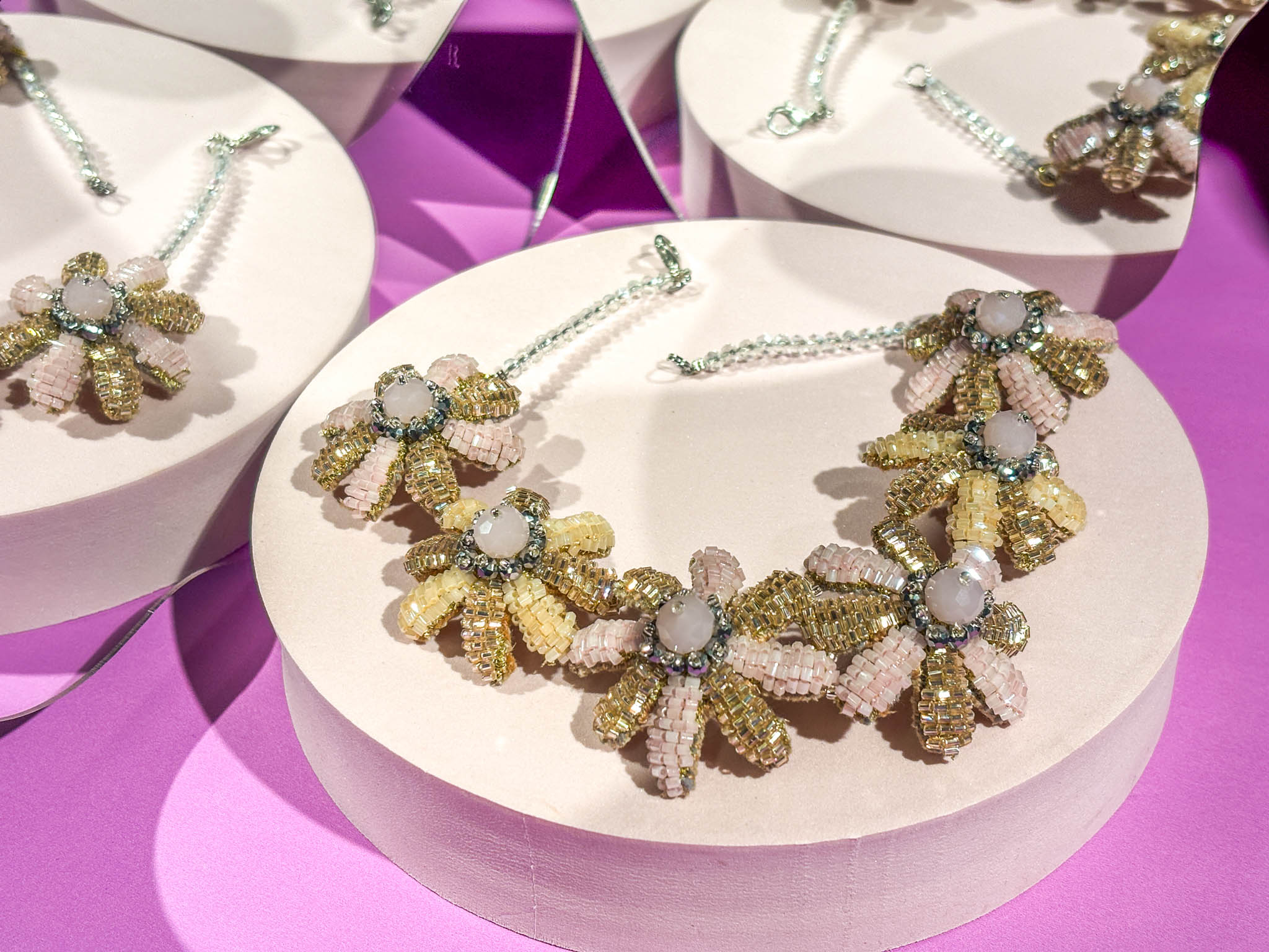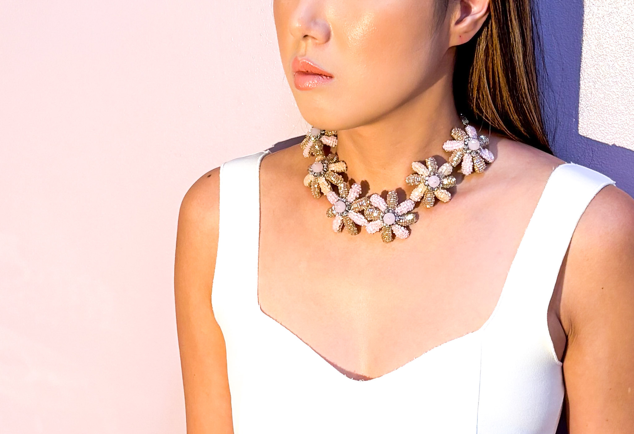 Bring back the 60’s with our Pretty Little Daisies Necklace. This flirty and fun piece is hand-embroidered with pink, peach, and rose gold japanese seed beads. Pair this with a cute white tube top or sweatheart neckline for an ultra fresh look.