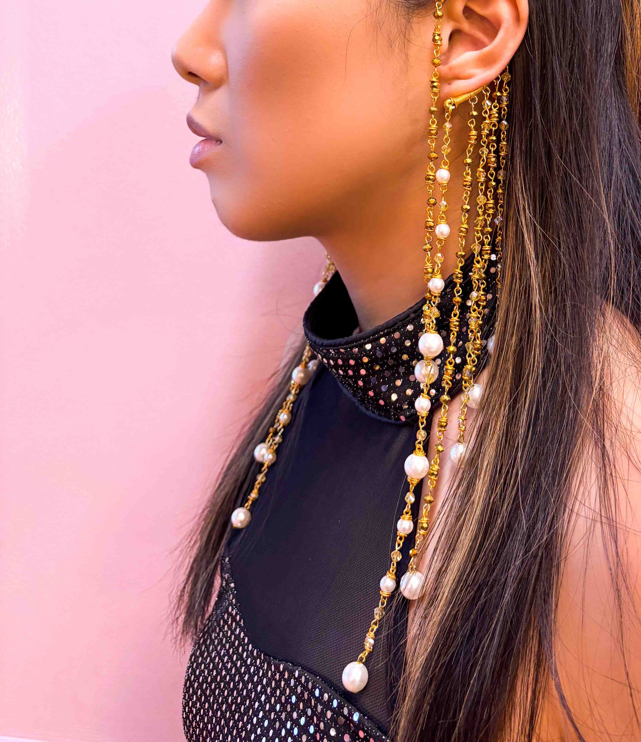 We took some of Rapunzel’s hair and added some swag. Wear glittery and shimmery locks all day and all night long with our Rapunzel Earrings in Gold Snow, and make your hair game strong. This pair is made of gold fire flash polished crystals and white maurica pearls hand spun in non-tarnish gold aluminum, and mixed with nickel.