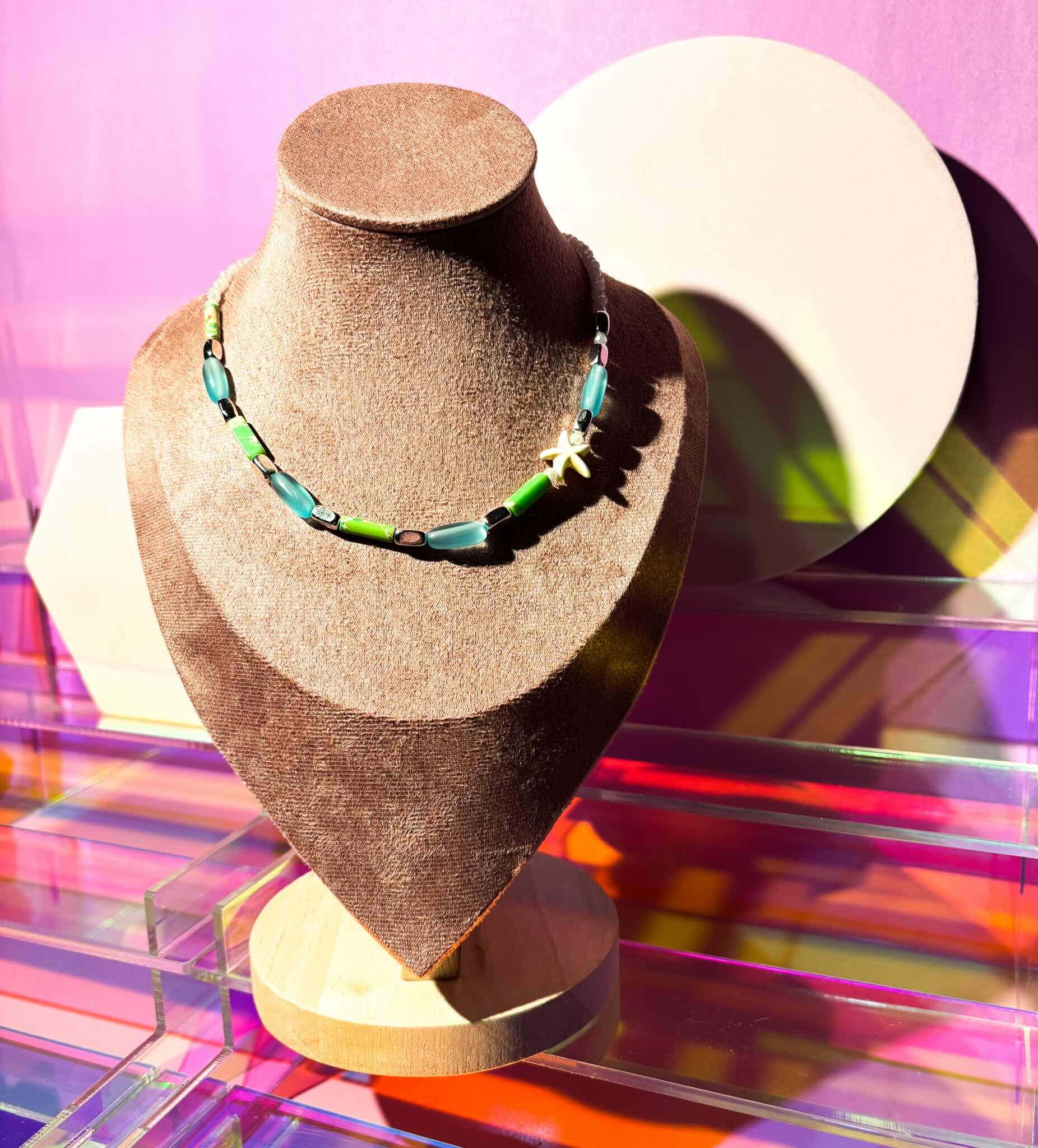 This necklace is made of lime green jasper stones, aqua cat’s eye, white howlite star, and silver iron oxide mineral beads, suspended in a dainty white ceramic crystal cord.