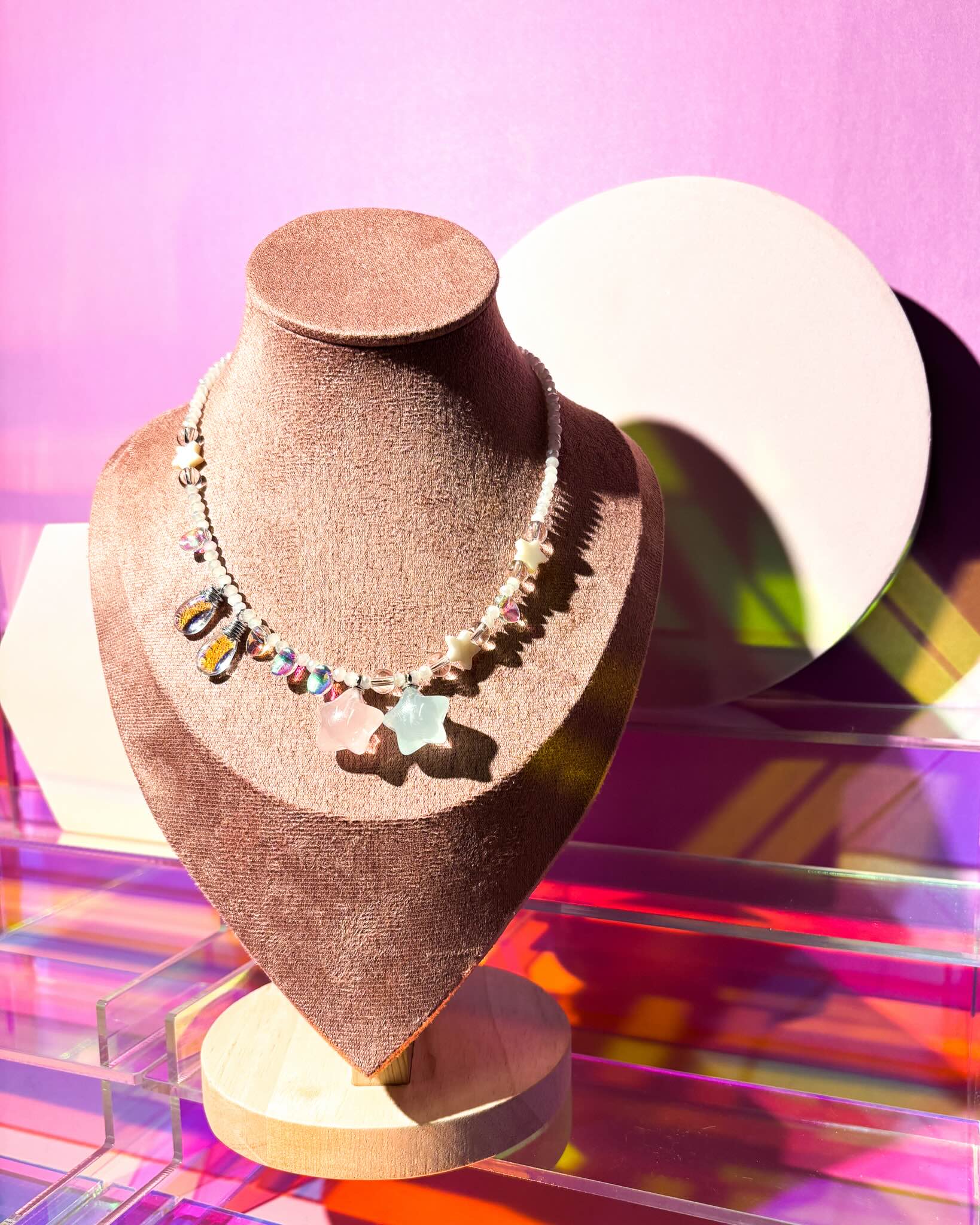 This necklace is made of pastel lucite star pendants, mother-of-pearl star beads, luminous glass water drops, suspended in a dainty white ceramic crystal cord.