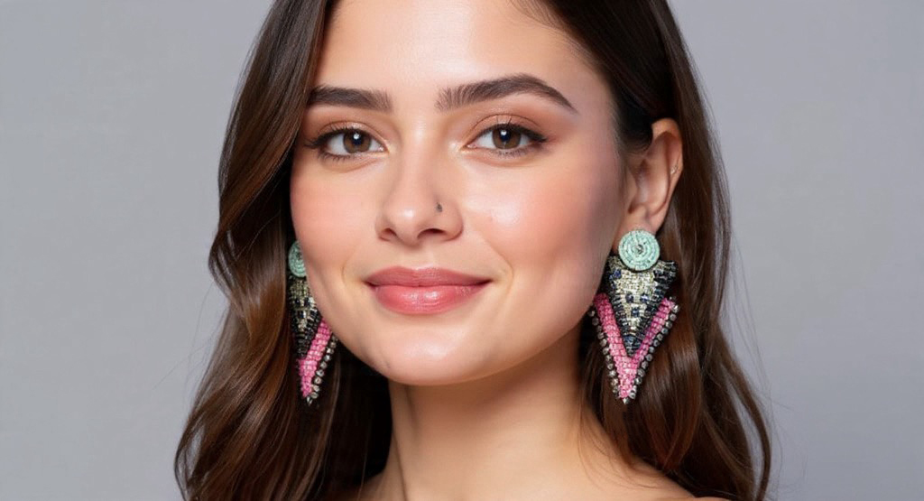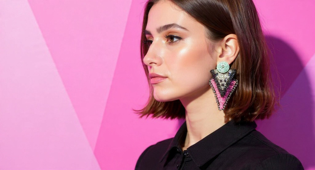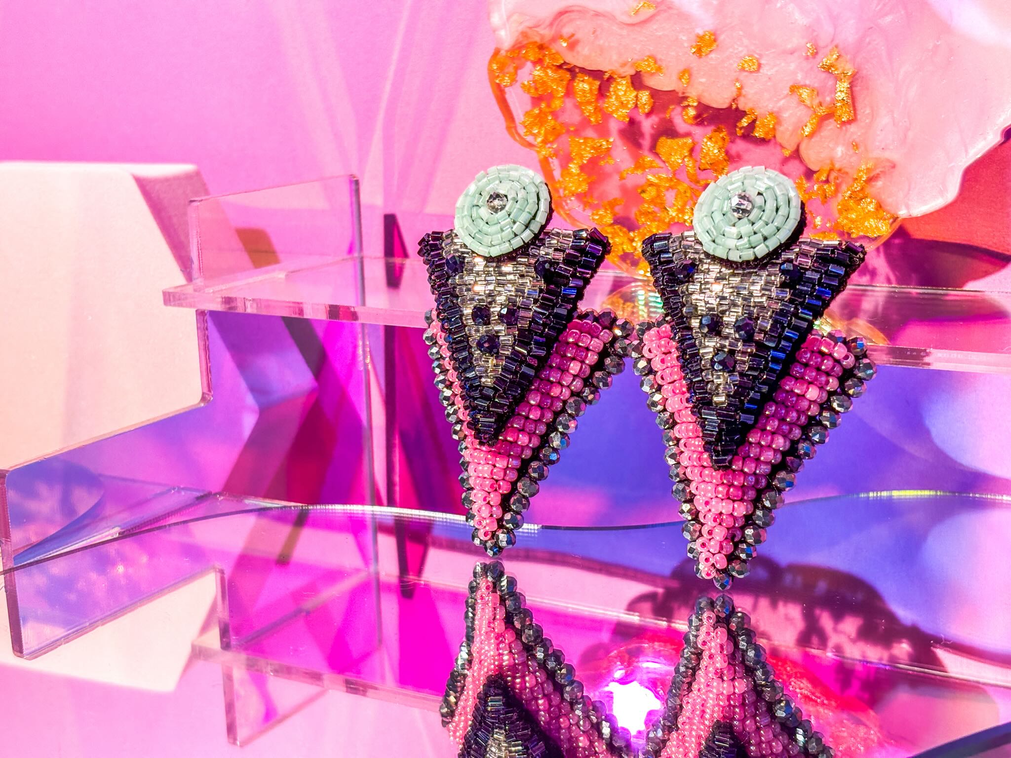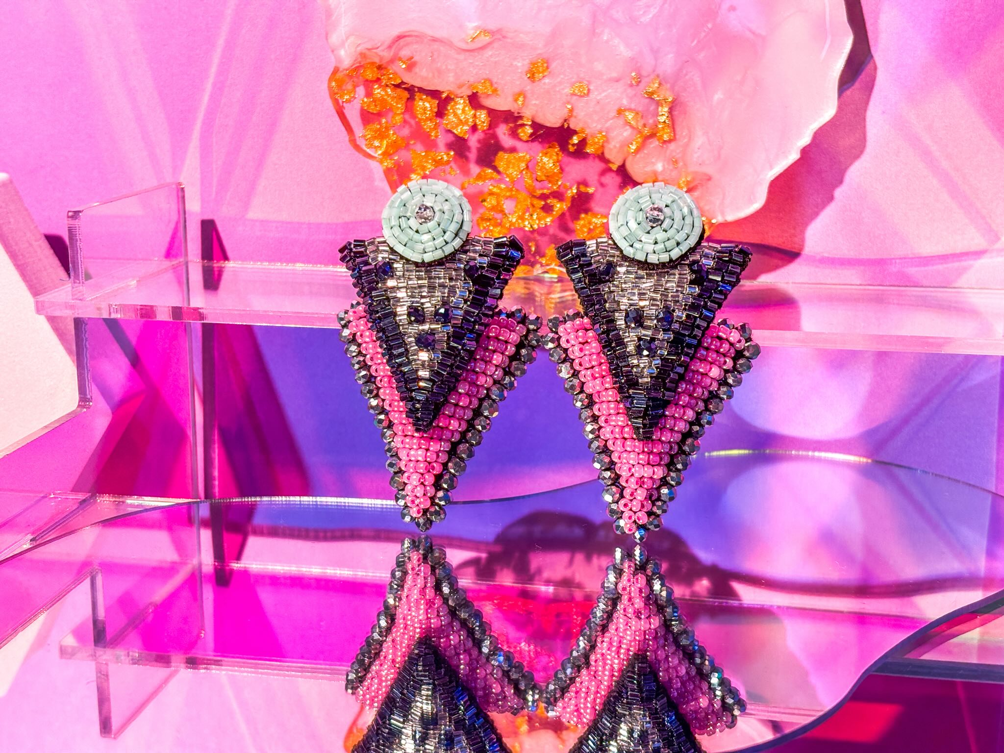 These rebellious triangle earrings in discoball bead work and high voltage colors bring back the glamour of the 80s. Each pair is meticulously hand-embroidered with premium japanese and taiwanese seed beads in electrifying sparkle. This pair is in electric pink and mint.