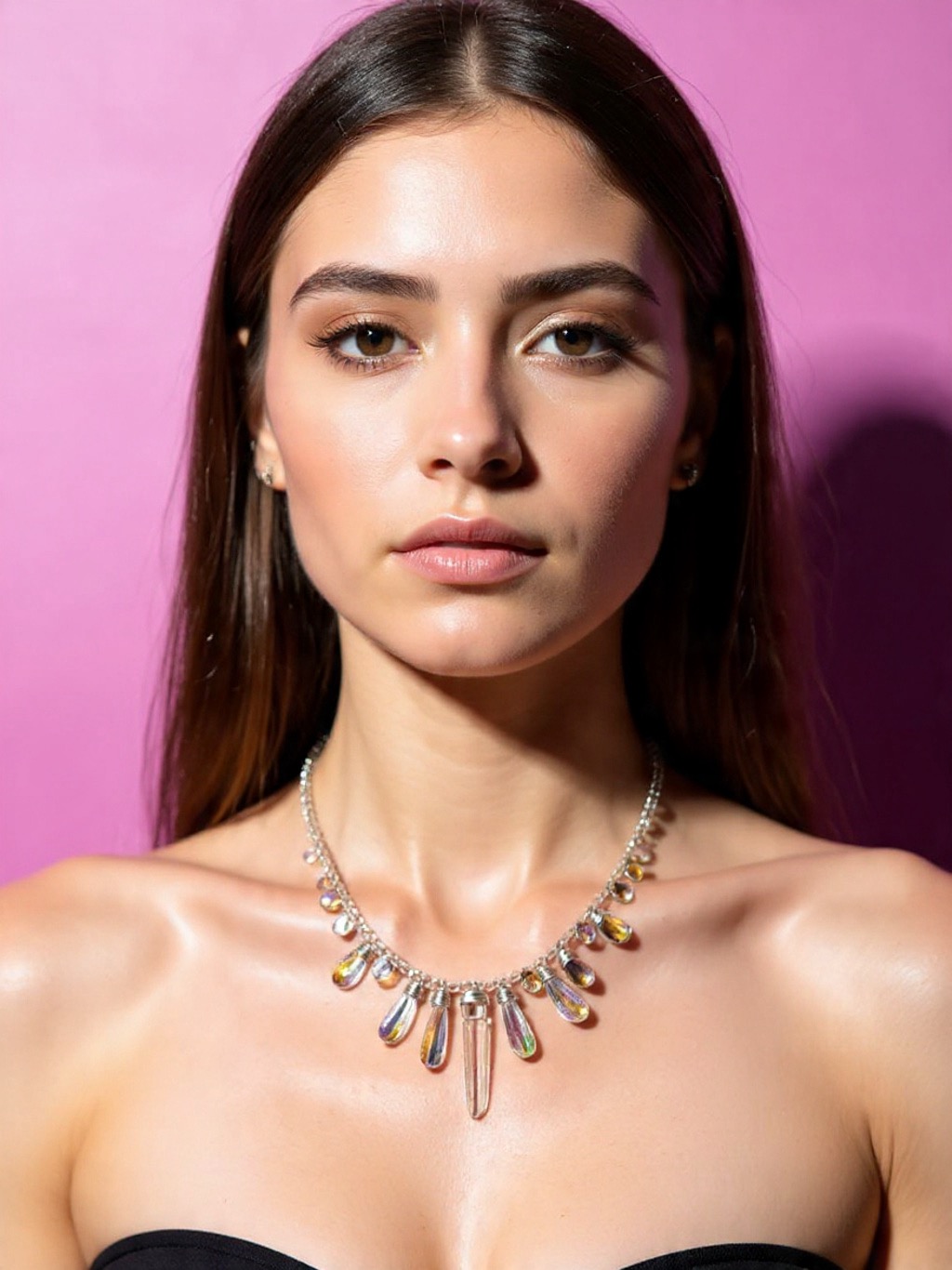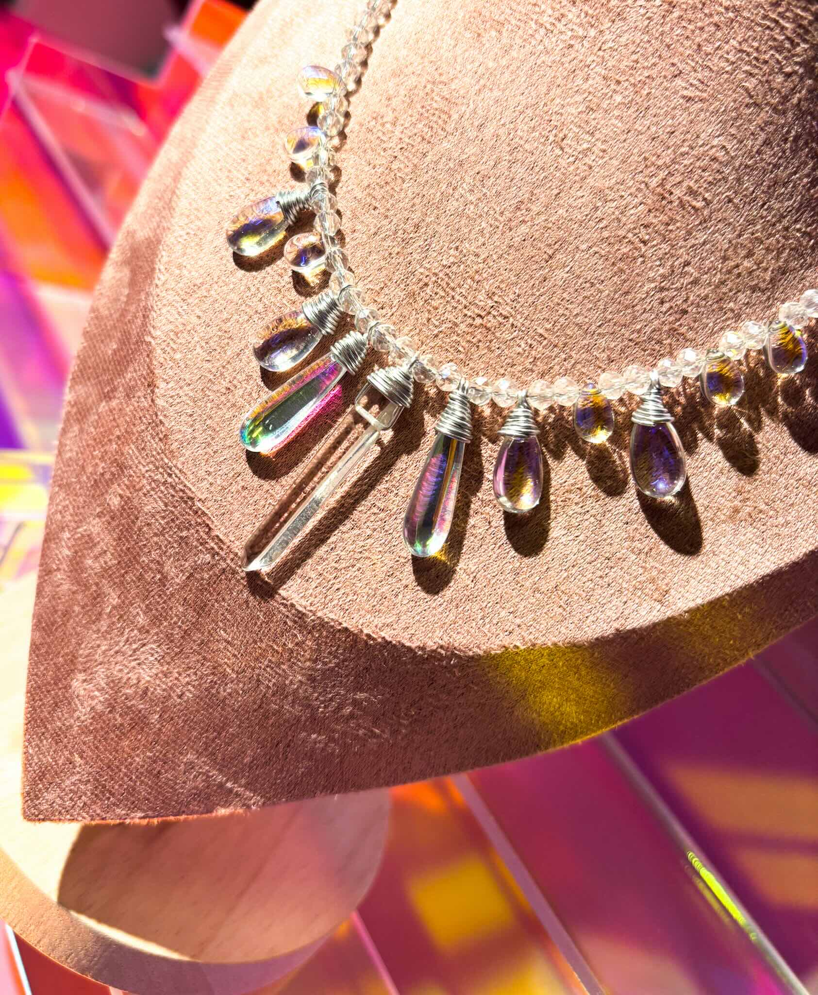 This necklace is made of luminous glass water drops and a natural quartz crystal in the middle, suspended in a dainty translucent crystal cord.